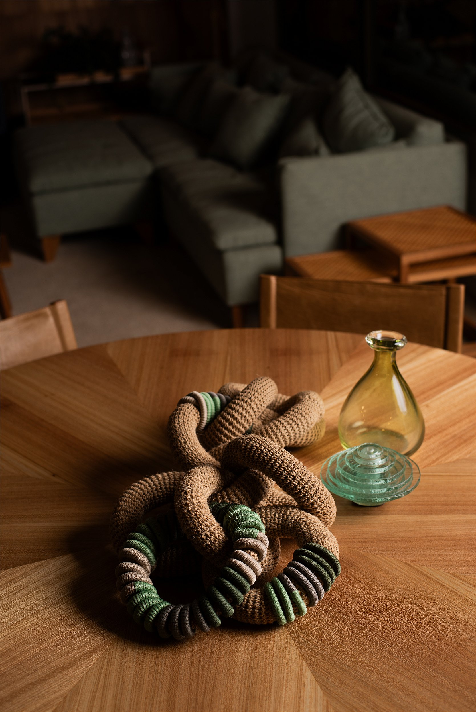 A Escultura Entrenós com Cadarço Colorido possui elos crochetados à mão com fios de rami e corda de algodão coberta com fios de poliéster.
